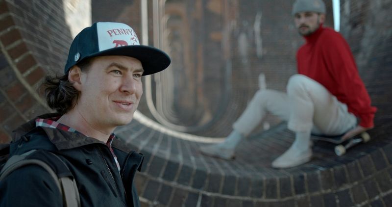 Photographer Lorenz Holder and skateboarder Vladik Scholz beside the base of a viaduct.